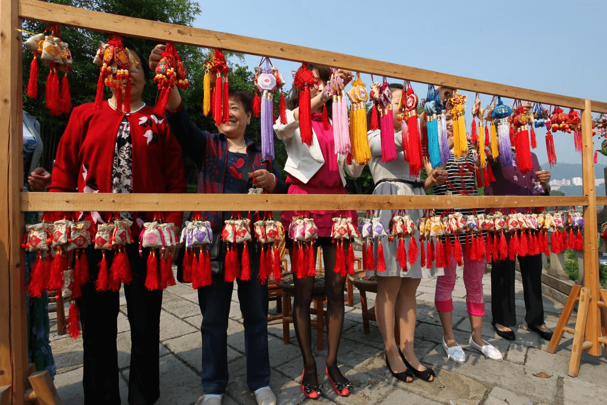 扎香包,是端午传统习俗之一。通常填充一些具有芳香开窍的中草药,有清香、驱虫、避瘟、防病的功效。端阳以四色线系臂,并佩戴香包,小巧玲珑精致美观。香包又叫香袋、荷包,一般是内装香料,用五色丝线缠绕而成,或者采用彩色绸缎或布块包上棉花,掺和着川芎、白芷、排草、芩草、丁香、山艾、细辛、甘松、甘草、雄黄粉等中药粉,再用彩绸扎绣而成,下边还垂上红、绿、青、蓝、紫各种线穗,佩在胸前,香气扑鼻。
