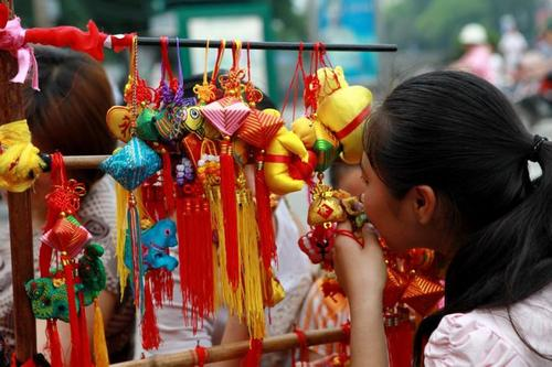 陈示靓的《岁时广记》引《岁时杂记》提及一种“端五以赤白彩造如囊,以彩线贯之,搐使如花形”。以及另一种“蚌粉铃”:“端五日以蚌粉纳帛中,缀之以绵,若数珠。令小儿带之以吸汗也”。