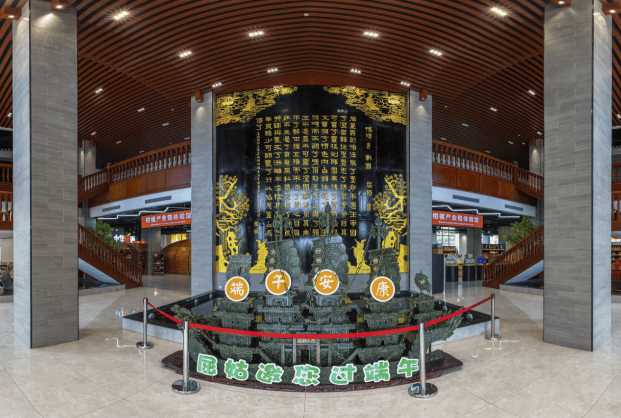 屈姑橘颂馆,以屈原名作《橘颂》为开篇,演绎秭归柑橘千年发展历程,运用本土文化资源向世界讲好中国“柑橘故事”,深入剖析《橘颂》作品背后的人和事,全面展示屈姑集团国家级龙业产业化龙头企业发展现状,以及柑橘产业未来发展方向。