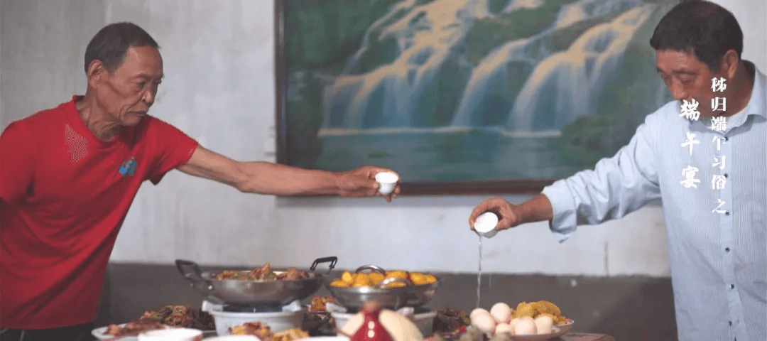 端午宴的食材选择更具时令特点,在过去,这个季节是食材最为丰富的时候。同时,农历五月,气候温热,易生病毒瘟疫,因此在这个时候,人们在食材的选择上也往往会偏向驱毒排湿、健脾补气,如黄瓜、苋菜、大蒜、糯米、鸡蛋等。宴席的桌上会放置三杯酒、三碗饭、三双筷,由家中长者敬天、敬地、敬屈原,邀请去世的先辈回家过端午,品尝端午宴。